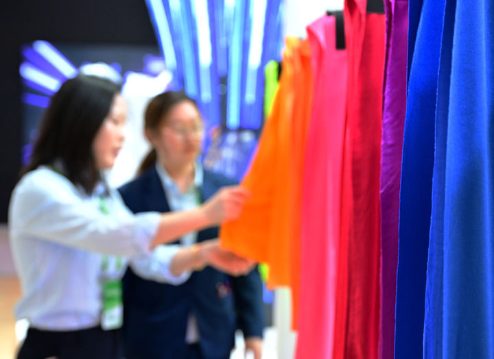 两名参观者在了解福建浔兴拉链科技股份有限公司的最新无水染色技术生产的布料。新华社记者魏培全摄