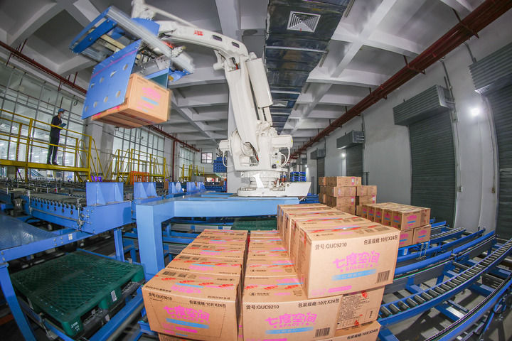 在福建省晋江市恒安智能制造示范基地,机械手在进行码垛作业。受访者供图